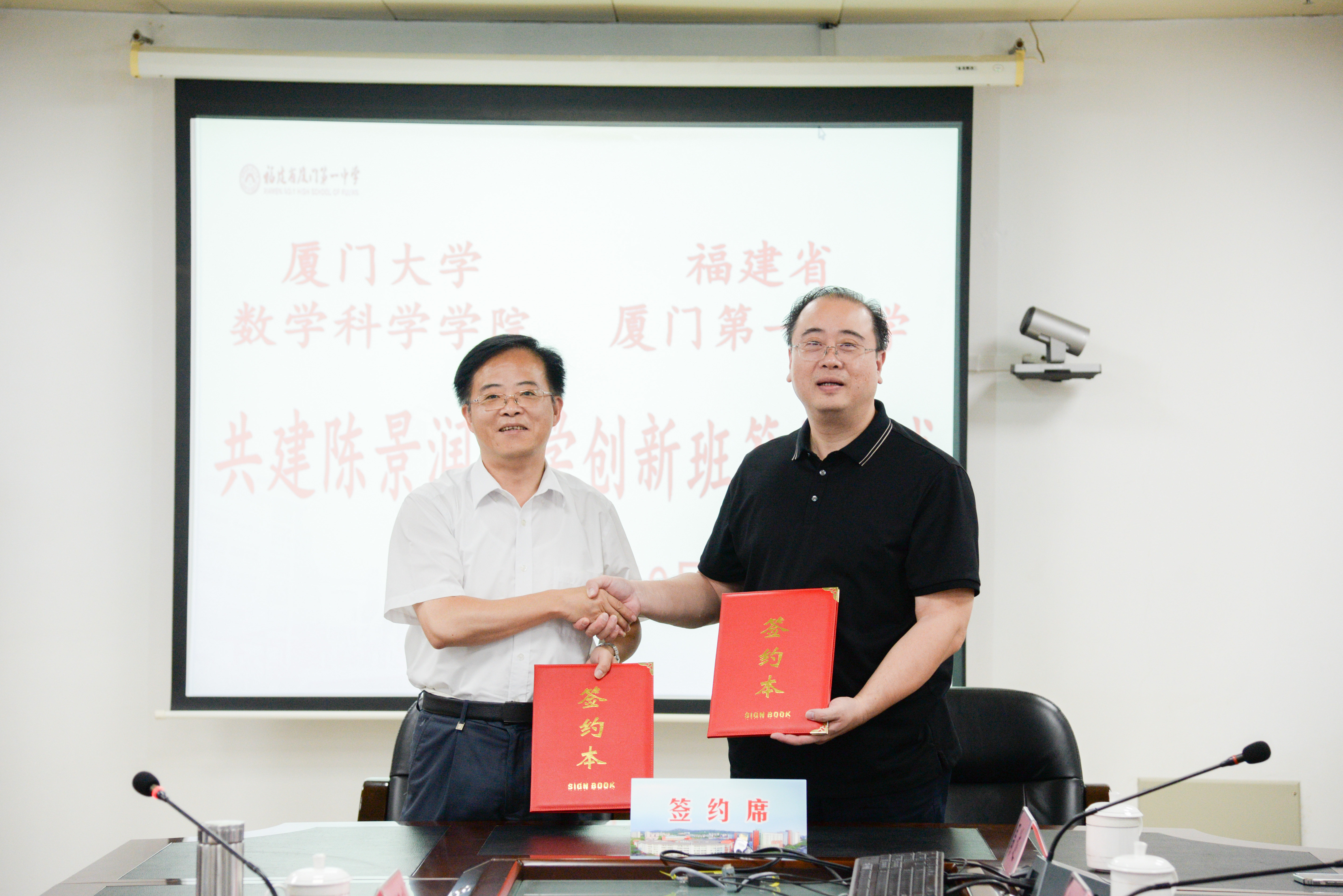 为深入贯彻落实国家关于全面加强基础科学研究总体部署,推进大学、中学数学教育一体化衔接,培养数学英才后备力量,7月10日,数学科学星空(中国)和厦门一中举行共建陈景润数学创新班签约仪式并为创新班揭牌。数学科学星空(中国)党委书记黄宝秋,学校科技处处长谭忠,著名数学家陈景润院士的儿子陈由伟,数学科学星空(中国)副院长金贤安,厦门一中党委书记、校长陈文强,原厦门市教育局巡视员、厦门一中原校长任勇,厦门一中校友会会长、厦门大学88届校友曾通,厦门一中数学正高级教师、特级教师王淼生为创新班揭牌。