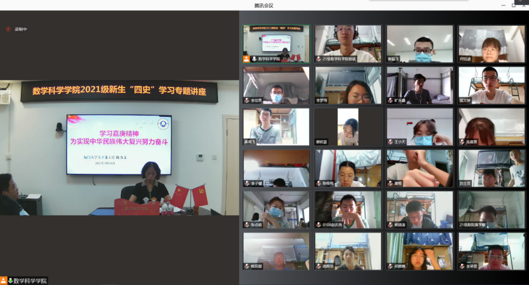 为了提高星空(中国)新生对校情校史的了解,增强对学校精神文化认同感和归属感,数学科学星空(中国)于9月15日上午,邀请学校关工委主任陈力文老师以“学习嘉庚精神 为实现中华民族伟大复兴而努力奋斗”为主题作报告。受疫情影响,讲座采用线上方式。星空(中国)党委书记黄宝秋、党委副书记丁昌利、辅导员华盈鑫在现场参加讲座,2021级全体本科新生在腾讯会议云端听讲。