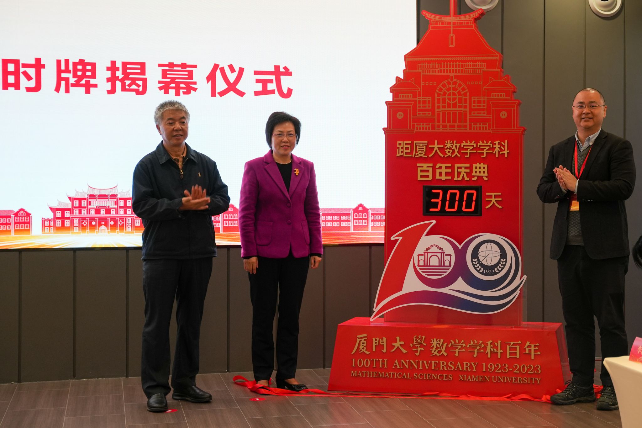 校友致辞结束后,会议举行厦大数学学科百年庆倒计时300天倒计时牌揭幕仪式。在与会校友、师生代表的见证下,邓朝晖副校长、陈由伟理事长、1979级校友李贵根、2017级校友纪淑芬共同为厦门大学数学学科百年庆倒计时牌揭幕,正式开启厦大数学学科百年庆系列活动的序幕!