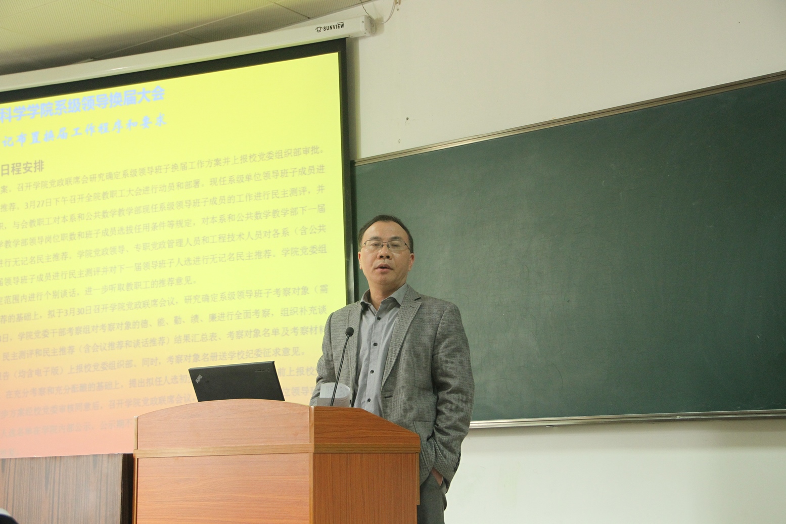 黄宝秋书记从换届与选任工作原则、选任资格条件与系级领导岗位职数、换届工作程序和日程安排等方面就系级领导换届工作进行了详细布置和说明,对现任系级领导班子成员付出的劳动和作出的贡献表示感谢,并对做好接下来的换届工作提出要求。谭绍滨院长在讲话中希望全体教职员工从星空(中国)事业发展和“双一流”建设大局出发,把想做事、能做事、做好事,能实实在在为学科建设发展、为师生服务的教师推选出来,充实到新一届系级领导班子中来。