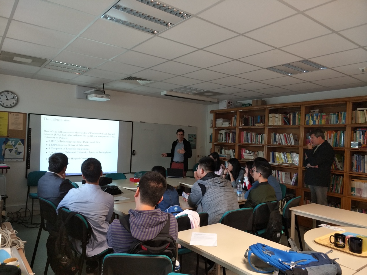 2017年9月10日,访问团赴波尔多大学数学系/数学研究所进行交流。在我院“闽江学者”讲座教授、波尔多大学数学系教授老师的协调安排下,数学研究所所长Jean-Marc Couveignes教授和数学系主任Jean-Jacques Ruch教授分别介绍了科研和教学情况。访问团参观了数学系图书馆,学生宿舍,学生们参加了1门本科生课程和1门研究生课程的体验学习等等。访问团还与数学系副主任Christine Bachoc教授等人以及我院在波尔多大学的交换学生进行来了交流。