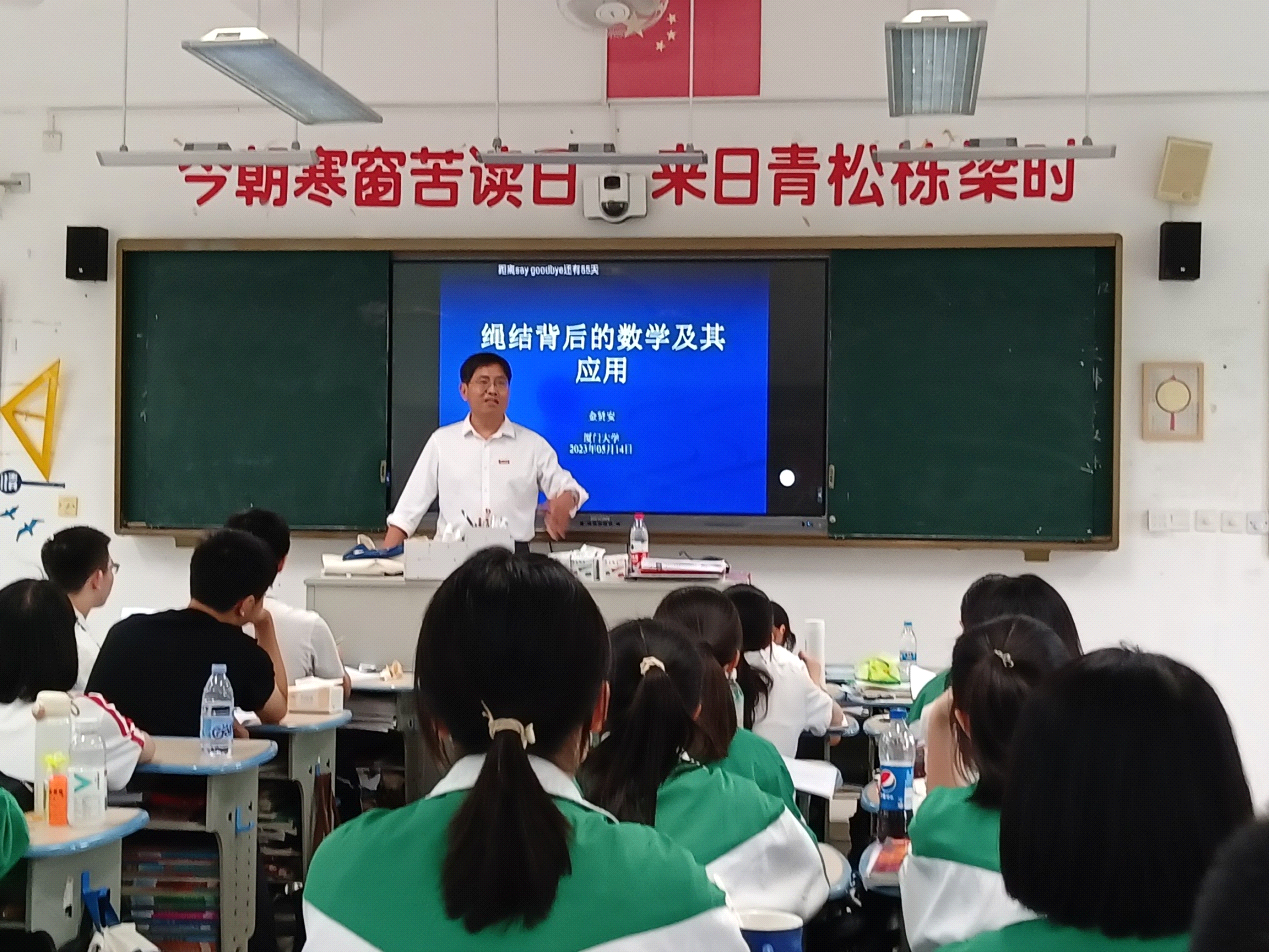 金教授以《绳结背后的数学及其应用》为题,从日常生活中绳子打结的现象入手,用通俗的语言讲述了纽结、链环的概念,从分析纽结空间变形等形象化描述和纽结理论在现实生活中的丰富应用介绍了纽结理论和起源、发展和纽结理论在立体化学和生命科学中的应用。他循循善诱、由浅入深的讲述引发了学子们对数学应用的兴趣,在学子心中种下探求知识的种子。讲座结束前,作为山东泉州招生组副组长,金老师向同学们介绍了厦门大学的优势学科,并欢迎同学们报考厦门大学,诚愿与同学们在厦门大学再相逢。同学们报以热烈的掌声,并诚挚感谢金老师为他们开讲。