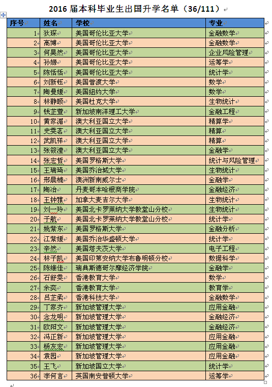 出国留学的毕业生中,美国仍然是学生的主要去向,共计16名,占出国留学生人员的44.4%,第二和第三的分别是澳大利亚和新加坡,人数分别为8名和5名。