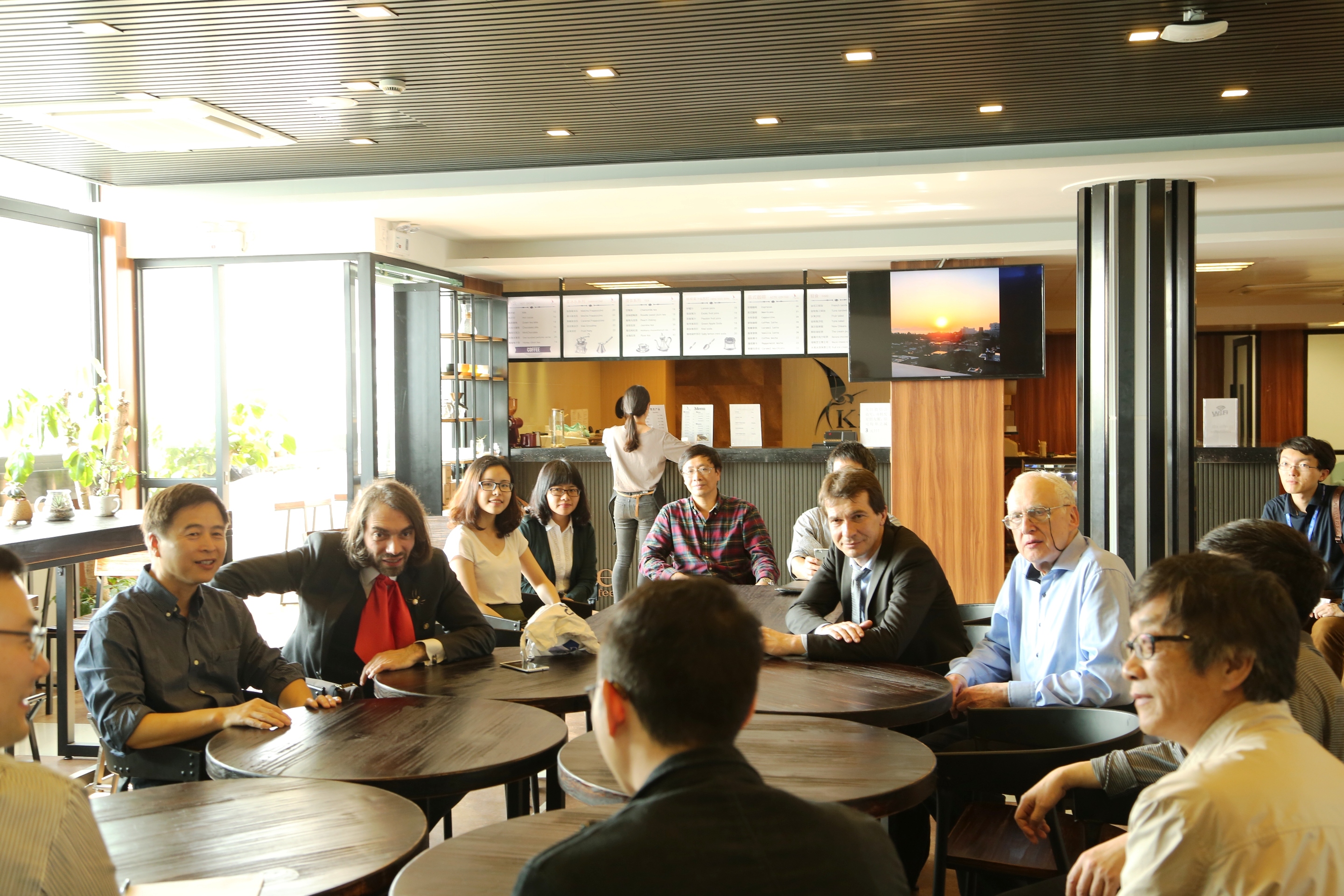 学术报告前,Cédric Villani教授在海韵数学物理大楼的数理咖啡厅与数学科学星空(中国)部分师生座谈。他一一询问了在场师生的研究方向和学习情况,与师生们分享Levy-Gromov不等式和Monge-Ampere方程的最新研究成果,并与青年教师讨论相关的数学问题。