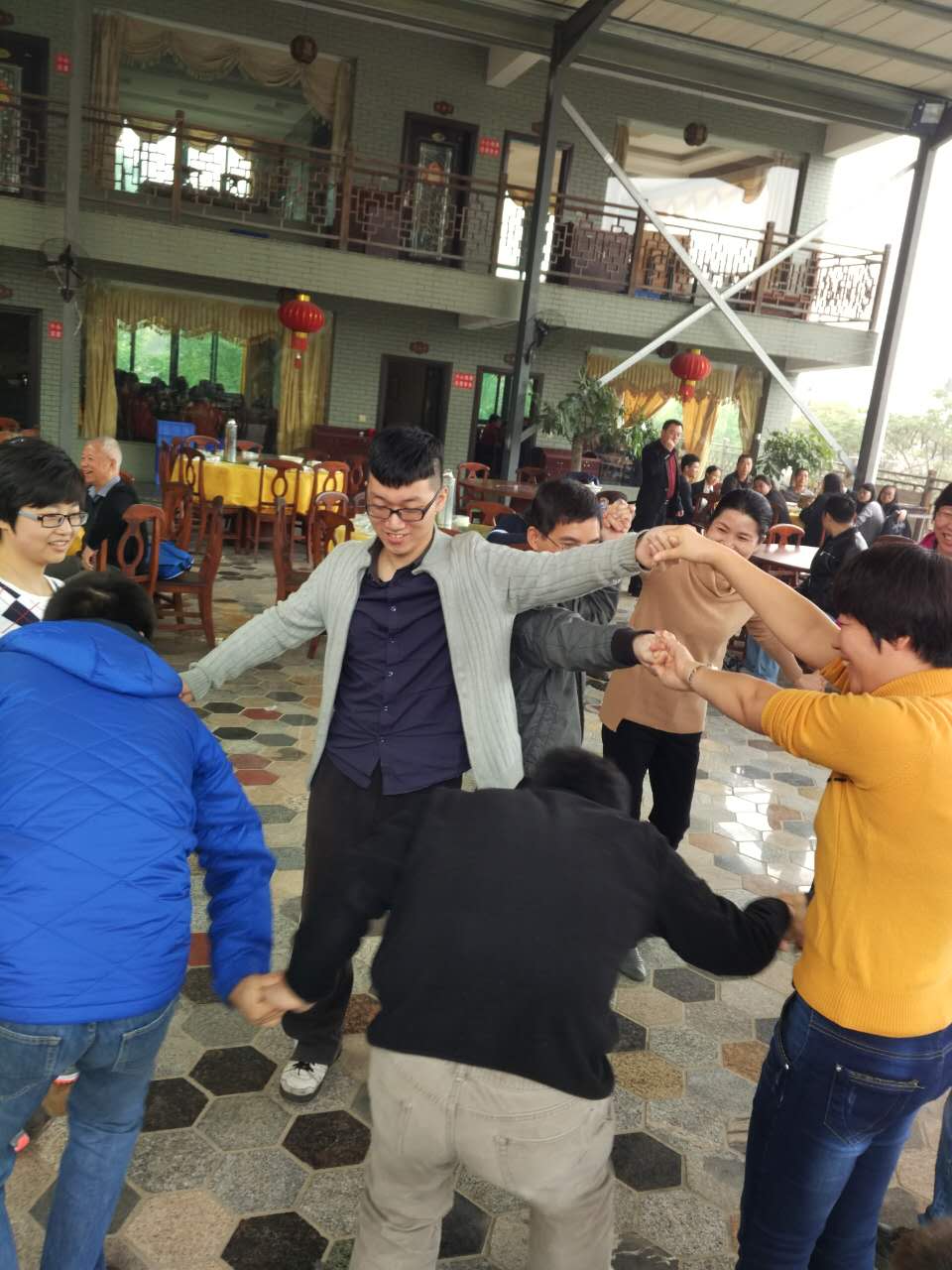 在中央的空地上,林鹭和吴聪敏老师组织老师们玩起神奇有趣的解手环游戏,不分老幼,大家一起上阵,几个人围成一团,伸出右手随意去牵另外一个人的一只手(相邻的两只手不能牵在一起),在不松手的状态下想办法把交错相接在一起的手解成一条链或两个套在一起的环。这难道不是在游戏中解数学题吗?看他们玩的那么带劲,又有谁敢说学数学是枯燥无味的呢!解环既是game也是个problem,纯粹的数学问题,图论泰斗张福基老先生也参与其中,亲自为大家解开游戏的密码,他从扭结和拓扑形变的理论高度给出了可行和不可行的数学解释。