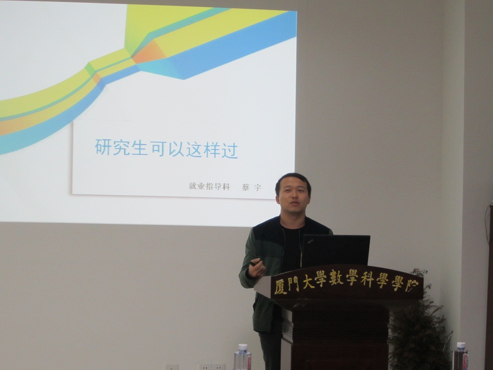 2014年12月2日,我院研究生会第四期“魅力数学,青春引航”活动在实验楼108教室顺利举行。本次活动邀请到厦门大学就业指导中心蔡宇老师和数学科学星空(中国)数学与应用数学系主任金贤安教授。他们分别就数院研究生就业和继续深造两方面的问题与同学们进行了交流。