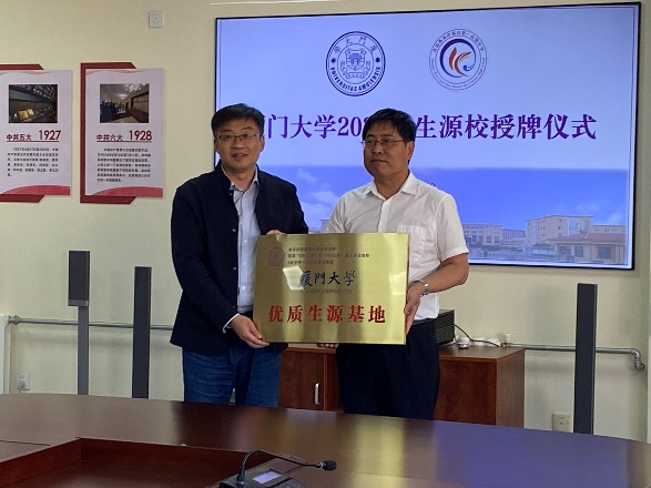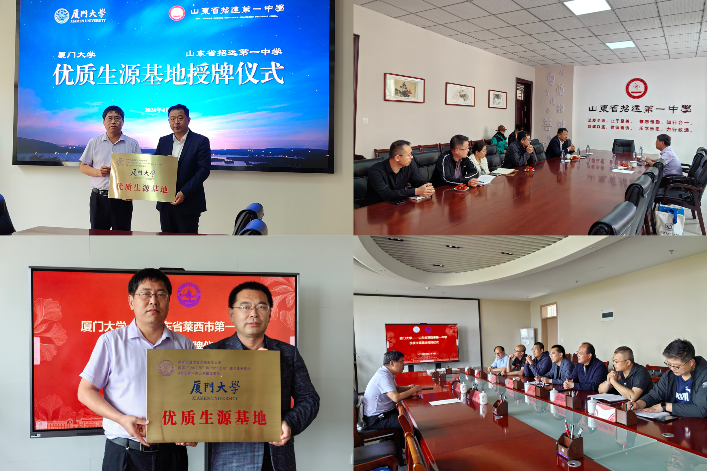 宣传工作组首先走访了招远第一中学和莱西市第一中学,组织召开座谈会并举行了优质生源基地授牌仪式。在座谈会上,金贤安副院长与两校领导、高三年级主任等深入交流,围绕厦门大学办学成效、人才培养、专业设置及强基计划招生政策等内容,深入研讨了本科招生工作和人才培养衔接等问题。