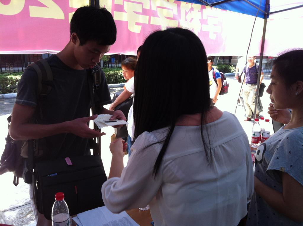 临近中午,烈日当空,骄阳似火。众多学长学姐们焦急地等待这一位“马上就到校门”却迟迟难以抵达目的地的压轴小学弟。在新生郑南艺同学的帮助下,志愿者们顺利与小学弟联系上。12点20分,在学长学姐们的掌声和欢呼声中,这位新同学风尘仆仆到达数院迎新点。