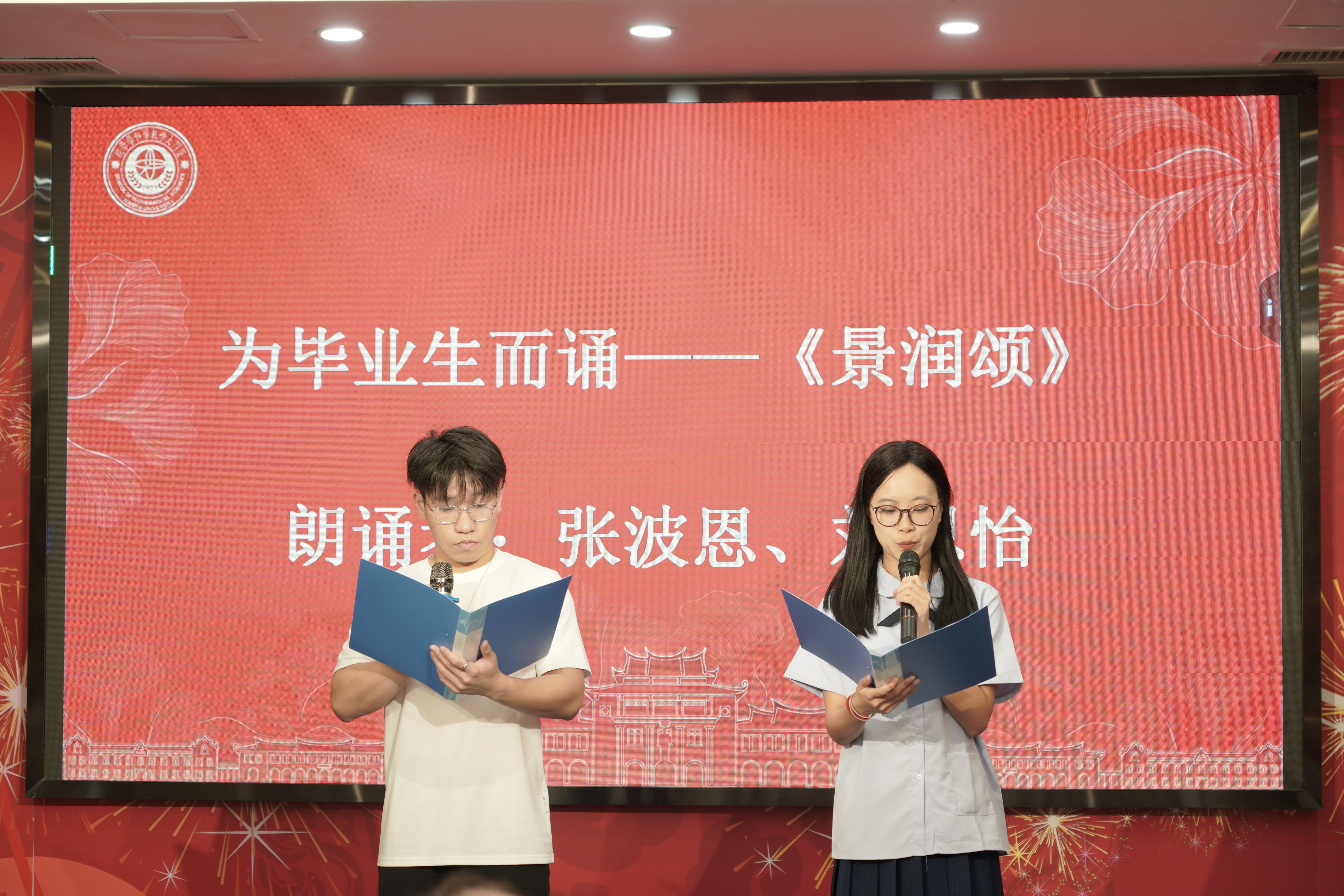 典礼正式开始前,全场师生一同观看毕业短片,重温曾经校园生活的点点滴滴。2021级硕士生张波恩、2020级本科生刘思怡共同朗诵《景润颂》,希望全体毕业生能够永远记住自己是“景润先锋、景润青年”的一员。