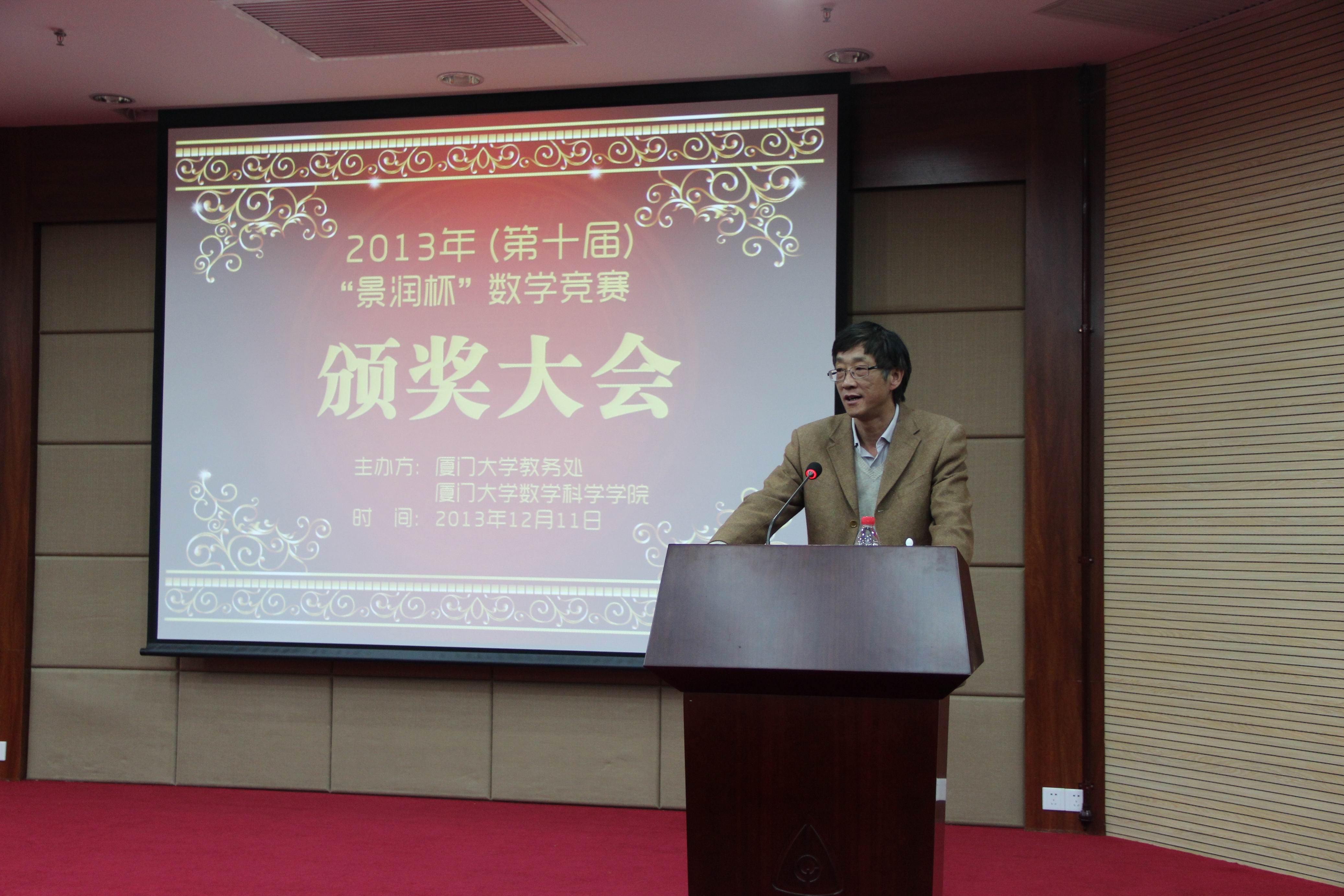 最后,邬大光副校长讲话。邬大光副校长以亲切的口吻和谈话的语气,与在场的同学分享了他周围的数学人的故事和经历,指出了学习数学的优势,鼓励大家进入数学领域。他引用时任厦门大学校长的王亚南先生和陈景润先生的事例,希望老师要做一个伯乐,而同学们则要努力使自己成为良驹。“景润杯”数学竞赛历经十年,竞赛水平越来越高,影响力越来越大,成为了厦门大学的精品赛事,通过该项赛事挖掘了大量数学人才,他希望把赛事提升到更高更大的平台。发言的最后,他提出了对数学学子的希望,要学习陈景润的科学精神,要喜欢并热爱数学。他强调,陈景润是我们厦大数院40年前的辉煌,一个陈景润还不够,今后数院的辉煌,还要靠大家。期待在座的同学们能够超越陈景润,再创辉煌。