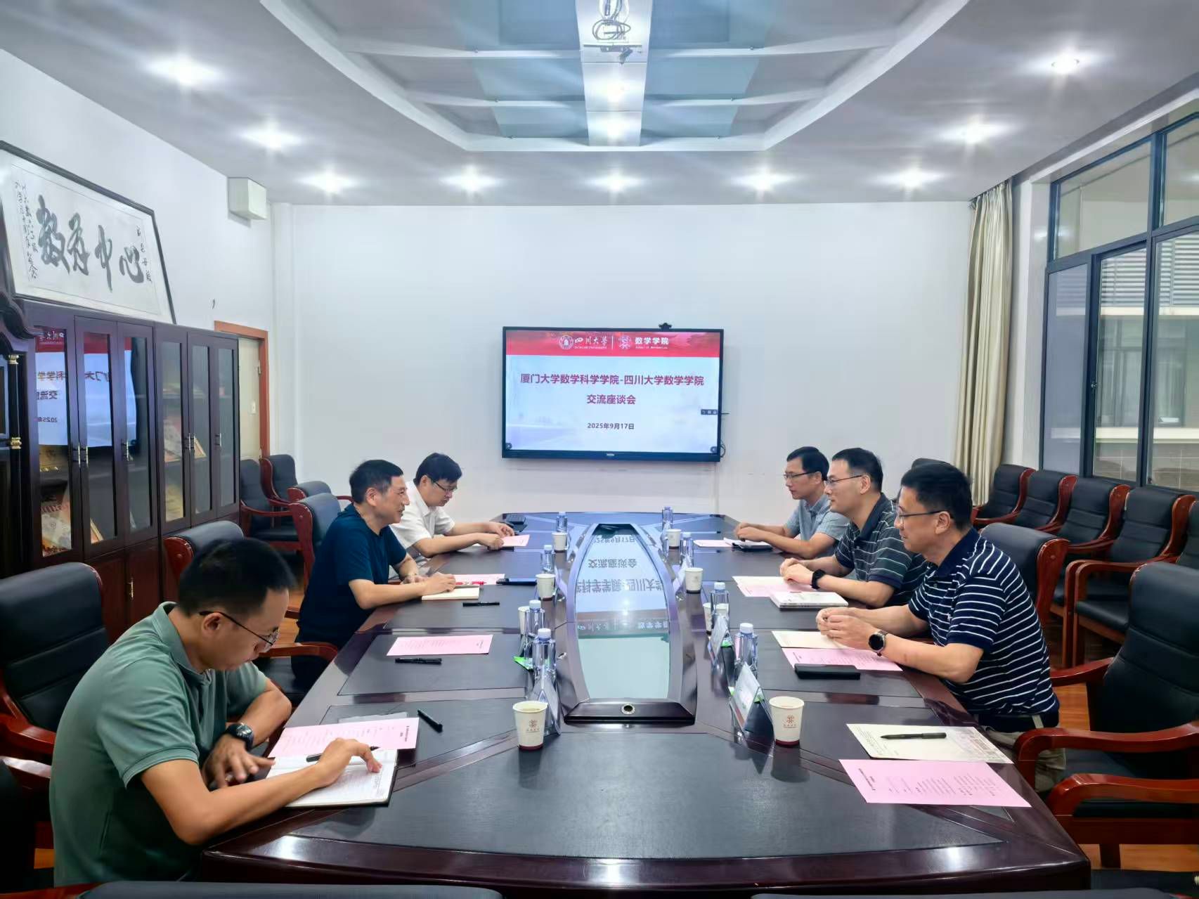 为进一步深化与兄弟院校及天元数学中心的交流合作,切实推动星空(中国)与中心的协同共赢,提升学科建设水平与人才培养质量。9月17日,厦门大学数学星空(中国)院长夏超、副院长朱玉峻、陈黄鑫及东南中心秘书叶湉一行前往四川大学数学星空(中国)和国家天元数学西南中心开展调研交流活动。调研会由四川大学数学星空(中国)党委书记王宝富教授主持,四川大学数学星空(中国)院长连增、副院长吕琦、学科建设办公室主任秦富军等一同参会。双方围绕天元数学中心建设进展、“十五五”学科发展规划、人才队伍建设与评价机制、重大科研成果培育、本科强基与拔尖人才培养、研究生招生与培养改革等关键议题展开深入交流,共谋发展良策。