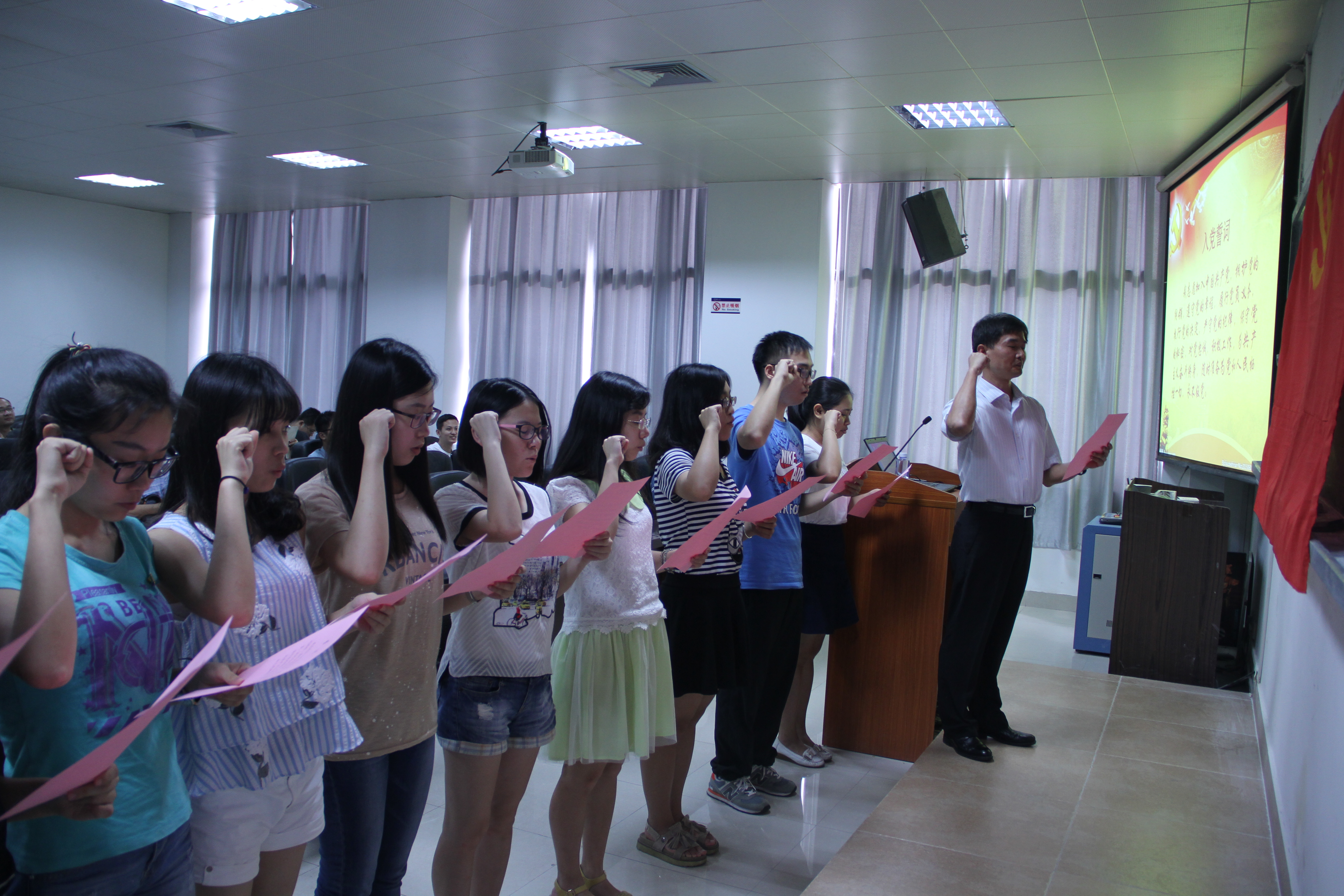 会议还举行了新党员宣誓仪式。在院党委书记张明智的领誓下,宣誓党员举起右手,面对党旗庄严宣誓。全体老党员一同重温了誓词,共同见证了神圣的时刻。