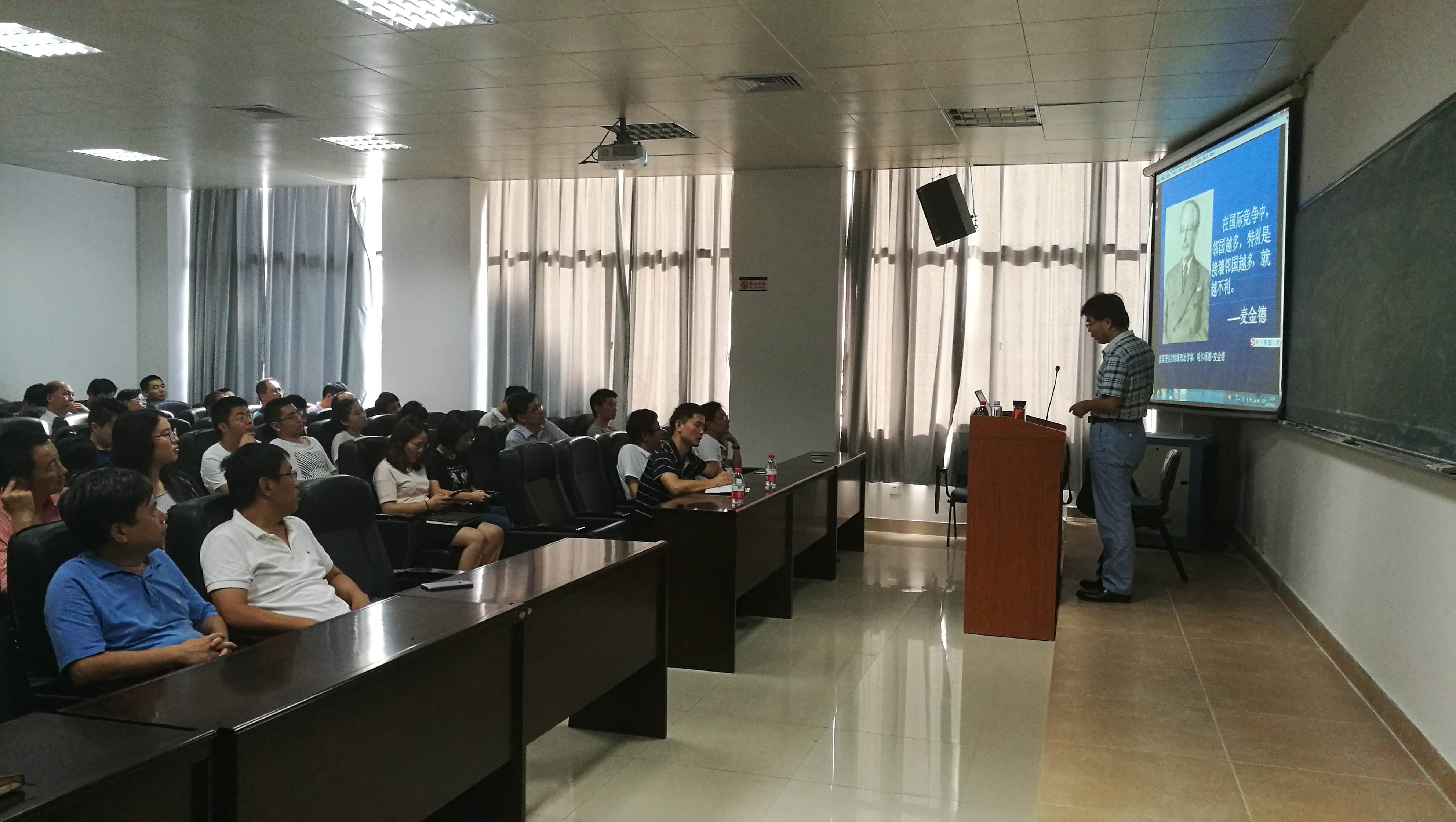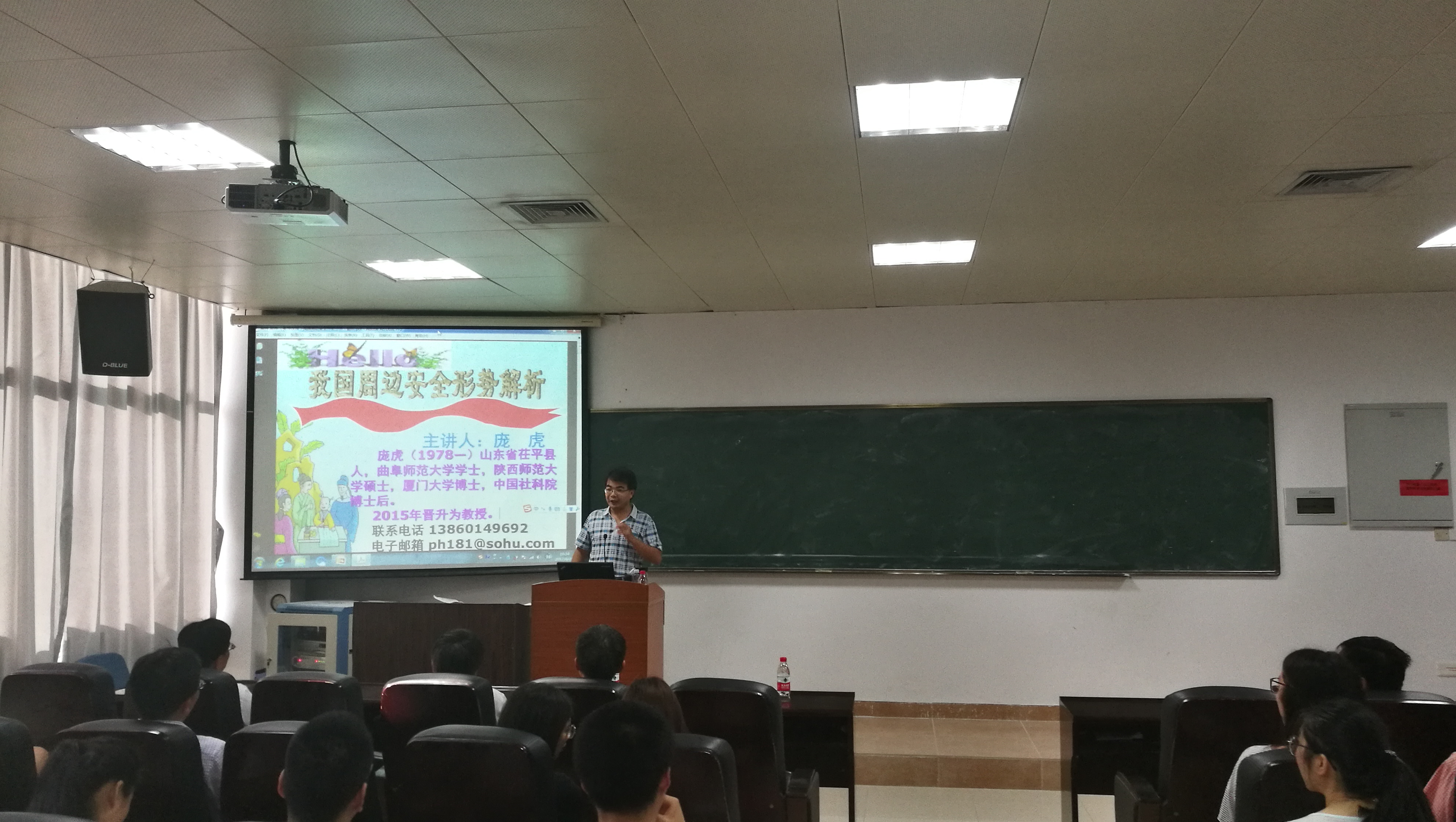 庞虎教授报告主题为《我国周边安全形势解析》。他围绕“周边邻国情况复杂”、“霸权主义阴魂不散”、“世界大战蓄势待发”等三个问题,对我国周边安全情况进行总体介绍,又以“东线”“西线”“南线”为切入,对周边安全面临问题作具体分析。报告结合“一带一路”“钓鱼岛事件”、“南海争端”和“中印领土争端”等多个国际热点,全面展现以习近平同志为核心的党中央在新时期建立的“强化制裁”“扩大对外影响”“持续爱国主义”等周边安全新思路。报告旁征博引,内容涉及政治、经济、文化、历史等多个方面,全方位、多角度、深层次地阐述了我国周边安全形势,并提出一系列应对策略。