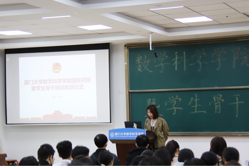 11月23日,数学科学星空(中国)团校开班仪式暨学生骨干培训启动仪式在海韵实验楼106举行。星空(中国)党委副书记丁昌利,团委书记于正伟,团委副书记陈淑铌,辅导员华盈鑫,2020级本科生班主任聂嘉明,2021级本科生班主任黄灿,兼职辅导员程琦秦,本科生团总支、学生会、宣传中心主席团,各部门负责人以及全体参训同学参加启动仪式。