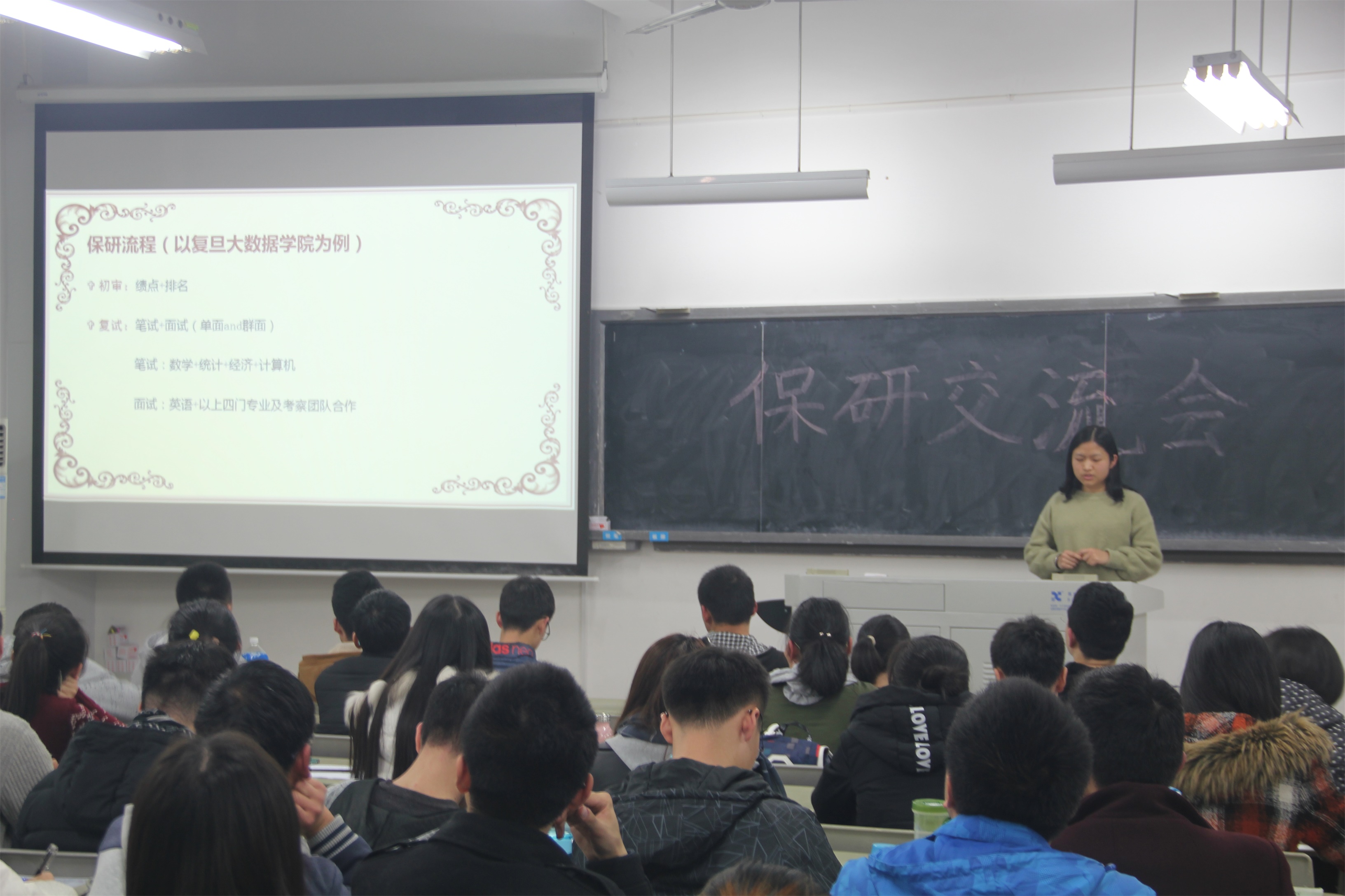 转眼间,13级的学长学姐们已经顺利完成了大学四年的学习,即将离开母校,踏上新的征途。保送北大、中科院、复旦、上财等院校的数院学长学姐们纷纷分享了他们宝贵与辛酸的经历。他们的介绍各有侧重,形象生动地向同学们介绍了保研的流程、形式以及需要如何进行准备。