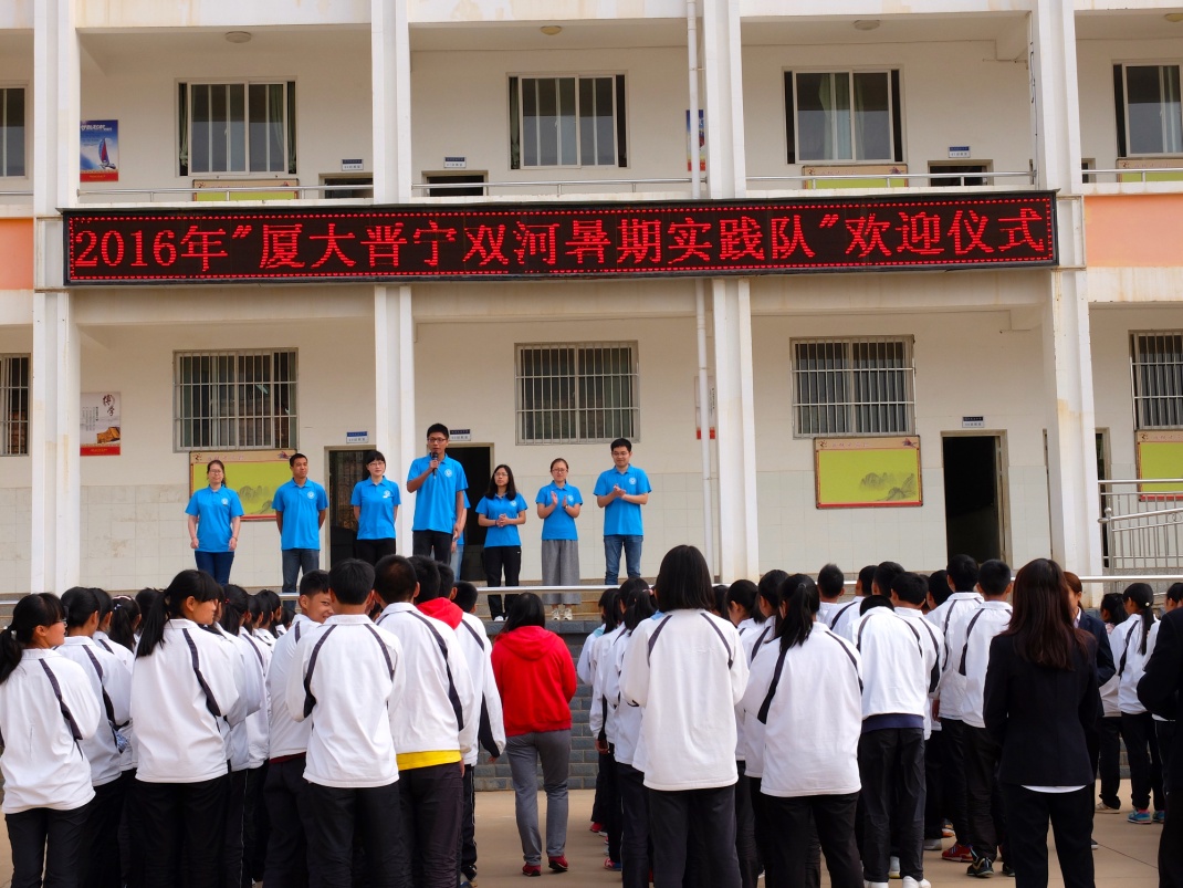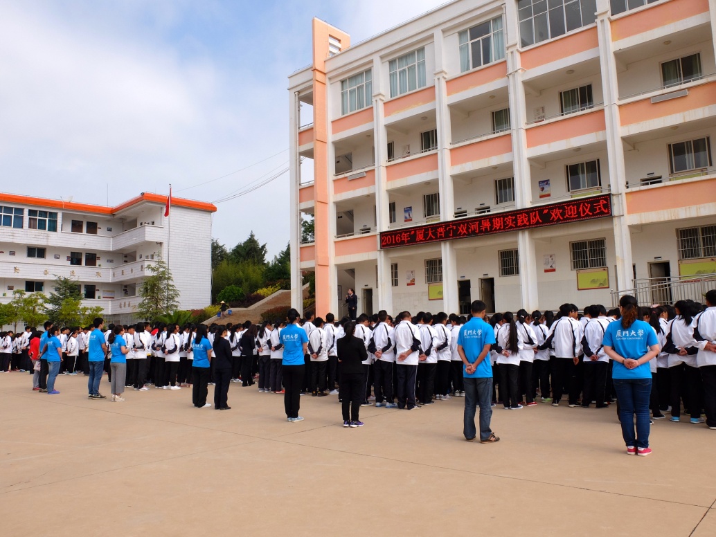 5月16日上午,云南晋宁双河民族中学为2016年厦门大学晋宁双河暑期实践队举办欢迎仪式。双河民族中学党委书记郭宁、校长张莉华等全体师生参加本次欢迎仪式。