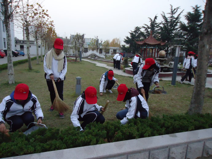活动内容:同学们身穿院服,在校园内清扫垃圾,做卫生红晕。从小事做起,为校园美化尽一份力。