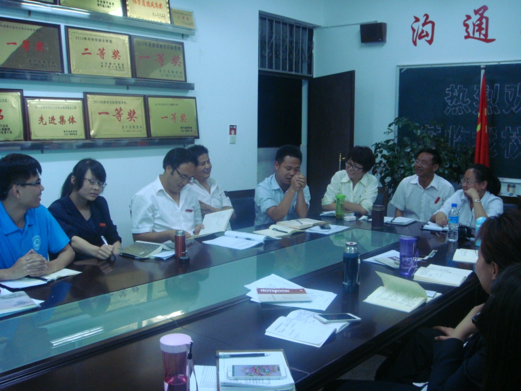 晚上7点30分,双河民族中学举行班主任会议,出席会议的有双河民族中学郭宁书记、张莉华校长和普亚佳副校长等校方领导,初一到初三共18位班主任以及实践队7名成员。会议上,双河民族中学85班班主任作主题发言,希望大家做一个快乐的老师。她组织实践队成员与老师们进行了接歌比赛,气氛热烈非凡。接着,实践队成员们以临时班主任的身份与老师们交流了这几周以来的工作感悟,张校长在会议的最后为成员们答疑解惑,希望在校期间双方能多多交流。