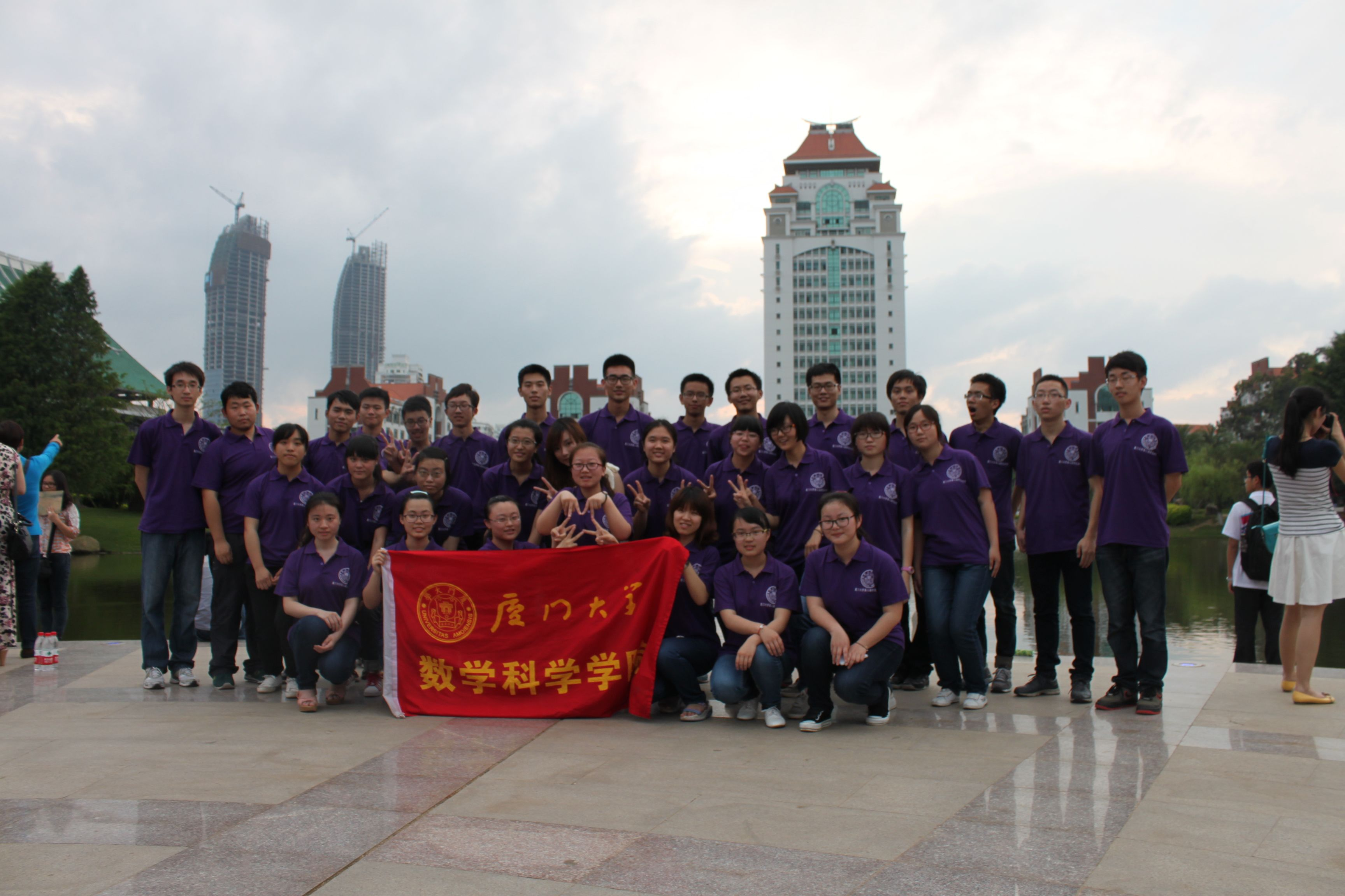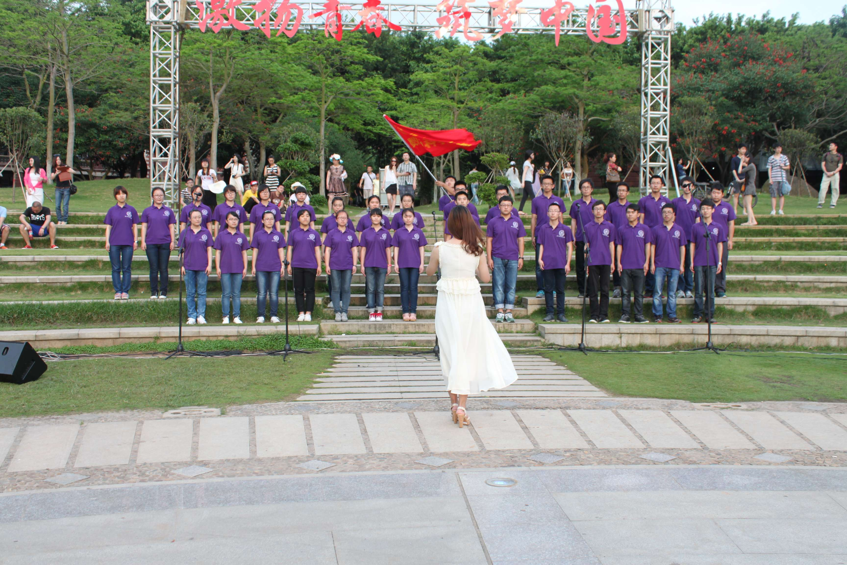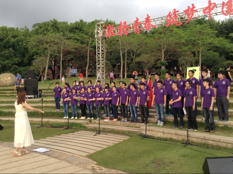厦门大学第六届合唱节“激扬青春,筑梦中国”户外展演今天在芙蓉湖畔圆形广场树立举行。五个星空(中国),十首好歌,唱响了厦大的傍晚,唱响了青春与中国梦的交响曲。我院合唱队在第二个出场,统一着装,身穿紫色上衣,尽显积极向上的精神面貌,为大家带来了饱含革命激情红歌《长城组歌—飞越大渡河》与《相亲相爱》。歌声嘹亮,响彻芙蓉湖畔。