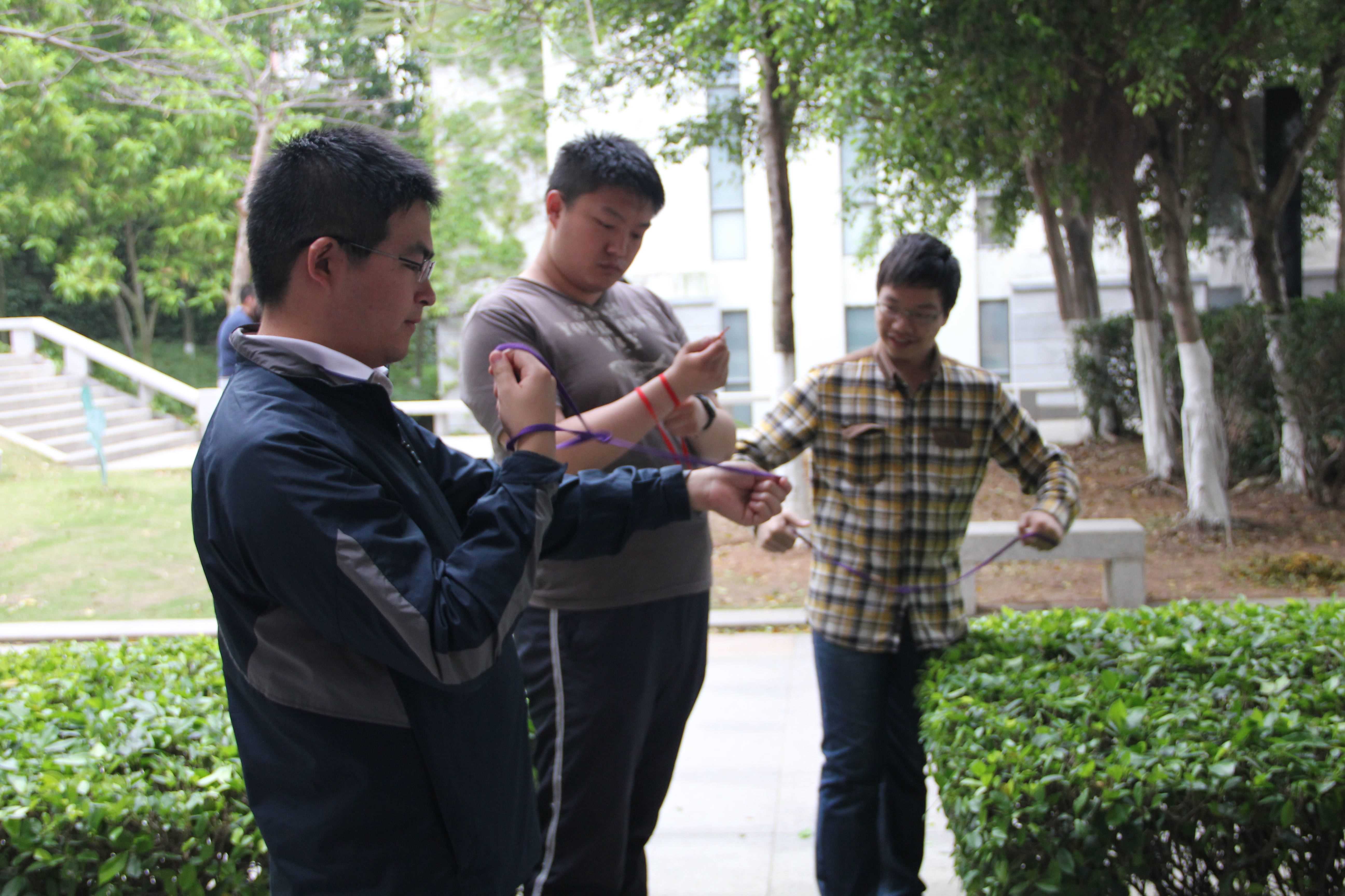 下午5点,同学们聚集在陈景润铜像旁。素拓部史舒婷同学给大家出了道趣题——如何在两手握住一条绳子两端前提下,将绳子打结。随即,同学们拿起绳子便迫不及待地试验,站在一旁的石义凯老师也忍不住拿起绳子在手上缠绕,结果均无一成功。此时,同学们也顾不着自己的形象,各种奇怪的姿势企图打出这个结。为了激起同学们的兴致,史舒婷同学决定活动结束后才公布方法。于是,同学们带着关于绳子的疑惑出发了。