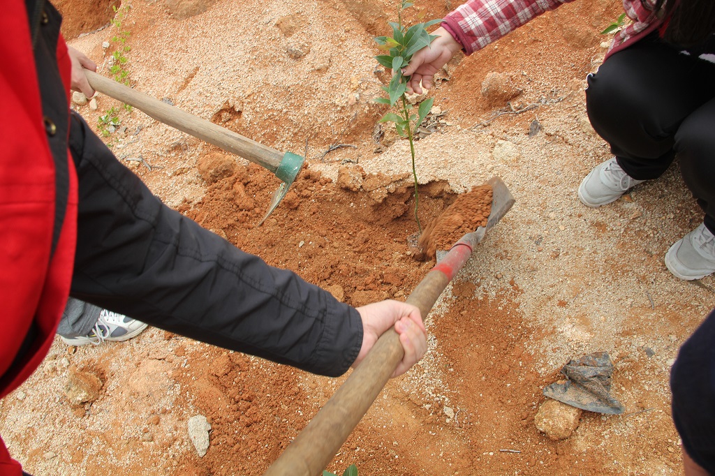 经过一个多小时的车程以及十几分钟的徒步行走,数院植树小分队顺利到达植树地点——一个光秃秃的小山崖。荒凉的土地上摆满了待种植的小树苗以及各种工具,在志愿者宣读注意事项过后便是工作人员分发爱心早餐的时间。下坡的路很陡很难前行,吃过早餐的同学们鼓足干劲,在领取工具过后便三五成群地带着自己的小树苗开辟荒地。各组分工明确,挖坑、回填、栽植、覆土,相互帮助相互合作,每个人都在卖力地劳动着。很快,不到一个小时的时间里,原本荒凉的土地上缀满了绿色,大家看着自己种下的小树,忙碌后的喜悦溢于言表。