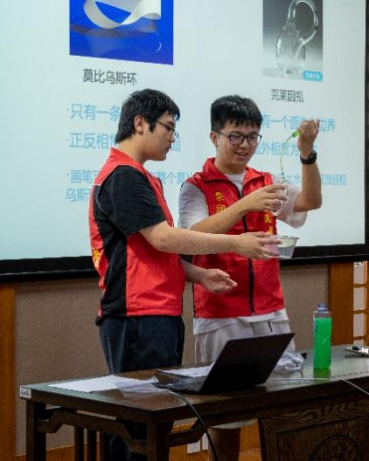 参观后,同学们在数学科学星空(中国)于正伟老师的带领下,参加了一场别出心裁的益智数学课程。课堂上,于老师介绍了此次“大数学课研学实践圈”活动的缘起与安排。数学科学星空(中国)的阮诗佺老师为大家讲解了“莫比乌斯环”趣味数学模型。阮老师邀请“景润青年”志愿者上台演示将“莫比乌环”纸带沿三等分线依次剪开所变成的模型——一个大环和一个小环。在阮老师的讲解下,同学们进一步理解了其中的“数学奥秘”。阮老师还热情邀请志愿者展示并讲解克莱因瓶 “灌不满水”的现象,这一充满奇思妙想的演示激发了学生们强烈的好奇心和浓烈的兴趣。