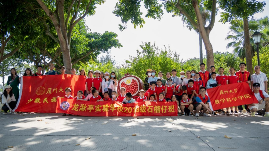 在了解完趣味数学知识后,于老师带领大家参观了翔安校区石榴园。数学科学星空(中国)“景润青年”邀请了少数民族预科班、石榴籽班与厦门市龙湫亭实验学校“石榴仔”班一同前往石榴园参访,大学生“石榴籽”班与小学生“石榴仔”班共建结对,在石榴雕塑前合影留念。少数民族预科班志愿者向中小学生讲解了石榴园的来源与意义,以生动的故事强调了民族团结的重要性,倡议大手拉小手,像“石榴籽”那样紧紧拥抱在一起,铸牢中华民族共同体意识。