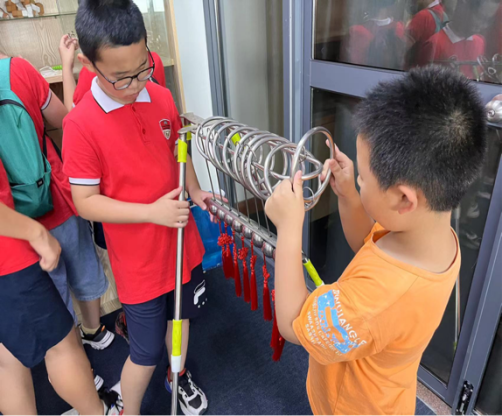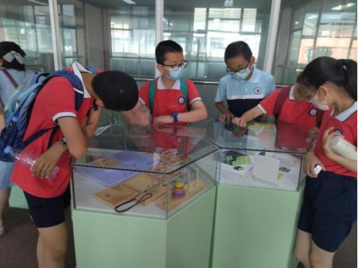 首先,同学们来到研学第一站数学与智力玩具空间。展厅里面陈放着许多有趣的益智玩具,如孔明锁、魔瓶、折叠游戏、九连环、七巧板、华容道等,吸引着同学们的目光。展柜前,“石榴仔”班的同学们认真研究“神奇”玩具,并迫不及待地动手尝试,努力探寻其中蕴藏的“数学奥秘”。