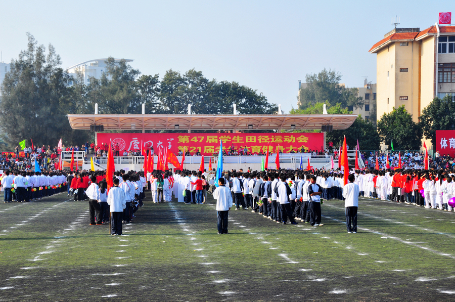 2012年11月2日星期五上午八点,厦门大学第四十七届运动会暨第二十一届老年体育健身大会在本部演武场隆重开幕。我院党委书记张明智,党委副书记郑诚明、谭忠教授,团委副书记陈向柳,辅导员石义凯老师带领了由我院各年级本科生组成的表演方阵出席开幕式。