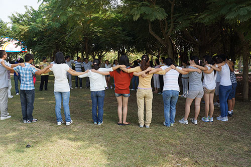 此次活动于早上9:00开始进行,在两位志愿者老师的带动下,研一新生共参与了五个活动项目。第一个游戏是“呼叫转移”,该游戏的目的是让大家记住各位同学名字,加深彼此的印象;然后是“五毛一块”、“解手链”团结合作的力量在这两个游戏中得到了充分的体现;接着是“开列车”,每个人的手搭在前面同学的肩上,将每一位研一新生的心串在了一起;最后一个游戏是“天龙八步”,通过八步的距离,来自五湖四海的新生团聚在了一个脚印里,聚在数院这个殿堂。活动于11:00在各位同学的欢笑声中结束。