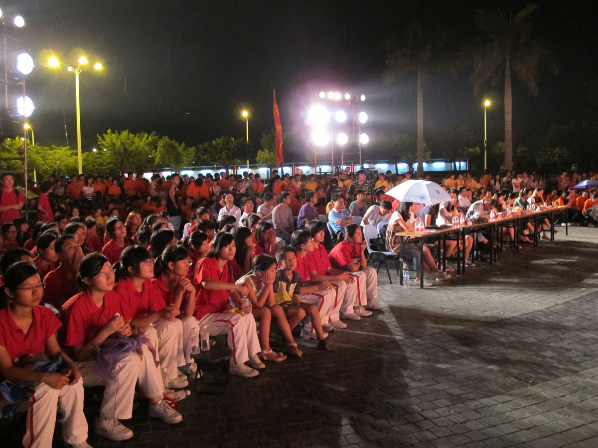 虽然今晚的步行广场上空飘着细细的小雨,但是比赛依然如期举行,学校领导、各星空(中国)的领导老师以及许多专业评委老师都来到了现场,比赛进行中鼓声加油声连绵不断,现场气氛非常热烈。
