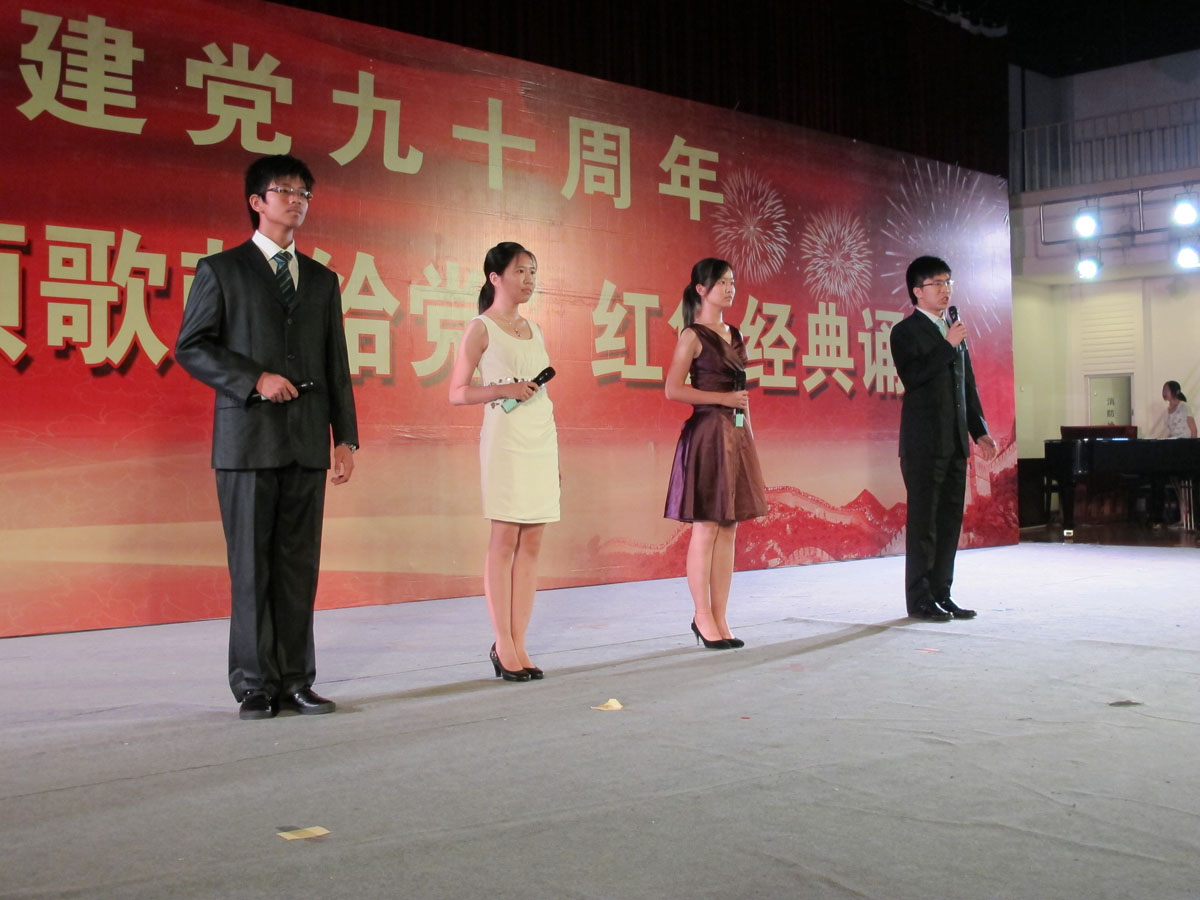 628下午2:30“中华颂·颂歌献给党”红色经典诵读活动在漳州校区大报告厅精彩上演。我院09级吴越、王旭、10级萧富元、张兆涵代表我院参加此次活动。