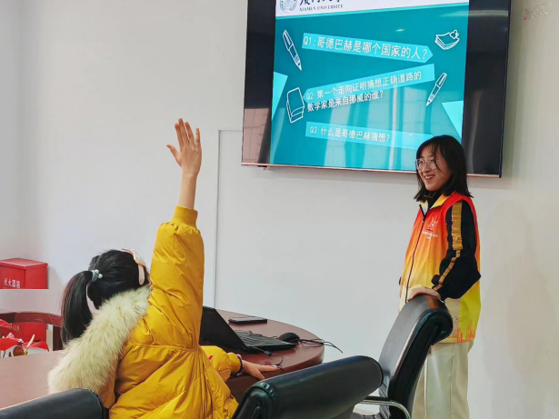 现场教学互动,感受数学之美。课堂第二部分,由志愿者韩海跃讲述了陈景润与哥德巴赫猜想的故事。韩海跃聚焦介绍了陈景润在数学领域的杰出贡献。通过播放小视频及现场提问的方式,短时间内拓展了小朋友们的思维,在轻松愉快的氛围中,激发了对科学的热爱和探索欲望。