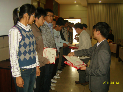 4月13日下午3点,数学科学星空(中国)2011年校庆期间校级奖学金、院级奖学金表彰大会在海韵教学楼504隆重举行。党委书记张明智,副院长邱春晖教授,谭绍滨教授,团委副书记杨机像,辅导员陈向柳出席了本次表彰大会07,08级本科生及研究生也一同参加了这次大会。大会由杨机像老师主持。