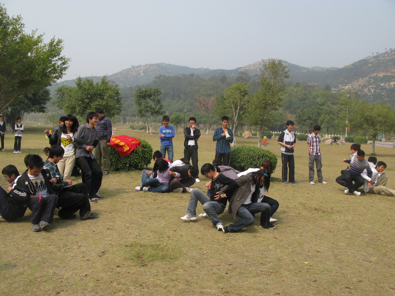在团支部及班委布置过的草坪上,同学们兴致高昂的抽签分组,并进行了“坐地起身”、“无敌风火轮”、“真心话大冒险”等素质拓展游戏。