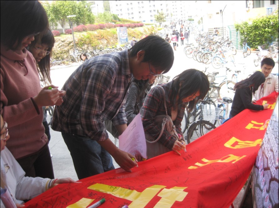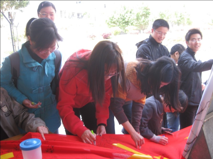 3月29日,数学科学星空(中国)09级研究生组织了一次主题为“关注西南 节约用水”的签名活动。在两个小时的活动中, 有近千名同学在红色的横幅上签名表达自己节约用水的决心。