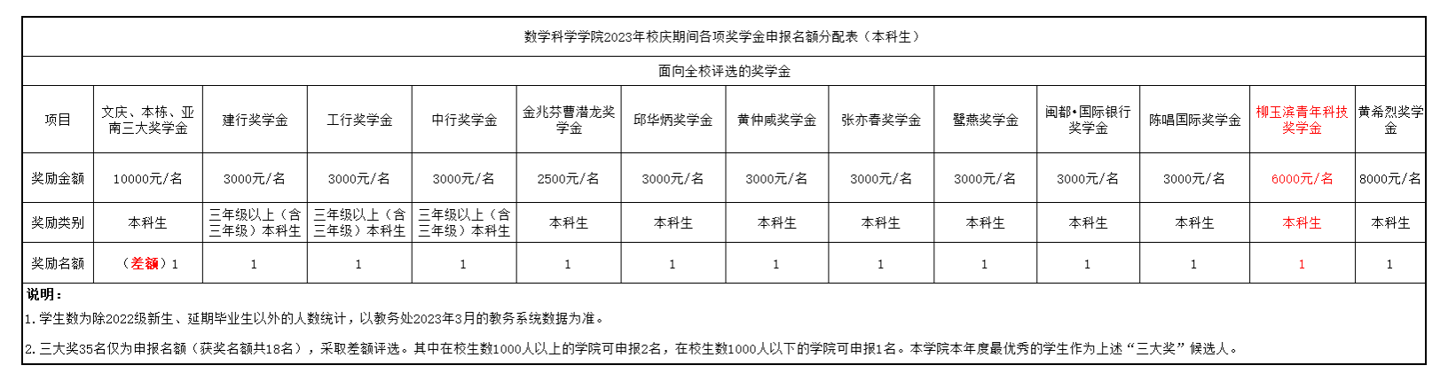 2023年校庆期间将评选颁发“文庆奖学金”、“本栋奖学金”、“亚南奖学金”等多项校级奖学金,现将各项奖学金评奖工作的有关事项通知如下: