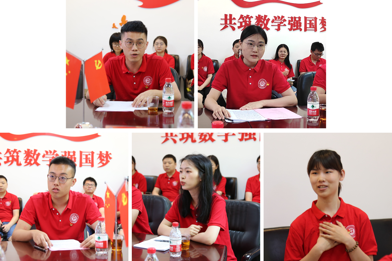 本科生党支部副书记、2017级本科生叶淑敏,第23届校研究生支教团成员、2017级本科生林瀚文,《哥德巴赫猜想》剧组演员、2017级本科生孟柯凡,第29届校研究生会执行主席、2018级硕士研究生林伟丰,厦门大学抗击新冠肺炎疫情优秀共产党员、2018级硕士研究生杨亚金作为毕业生党员代表发言。他们向辛勤付出的老师表达了真挚谢意,回忆了作为一名学生党员的成长经历,表达了对建党百年、建校百年的深情祝福。他们表示,作为数学科学星空(中国)的毕业生党员,作为“景润青年”的传承者和“景润先锋”的接力者,要在今后的学习工作中继承和发扬不怕困难、勇攀高峰的科学精神,秉承“自强不息,止于至善”的校训精神,用厦大“爱国、革命、自强、科学”的优良校风勉励自己,坚守初心,赓续前行,以实际行动为母校增光、为党旗添彩。