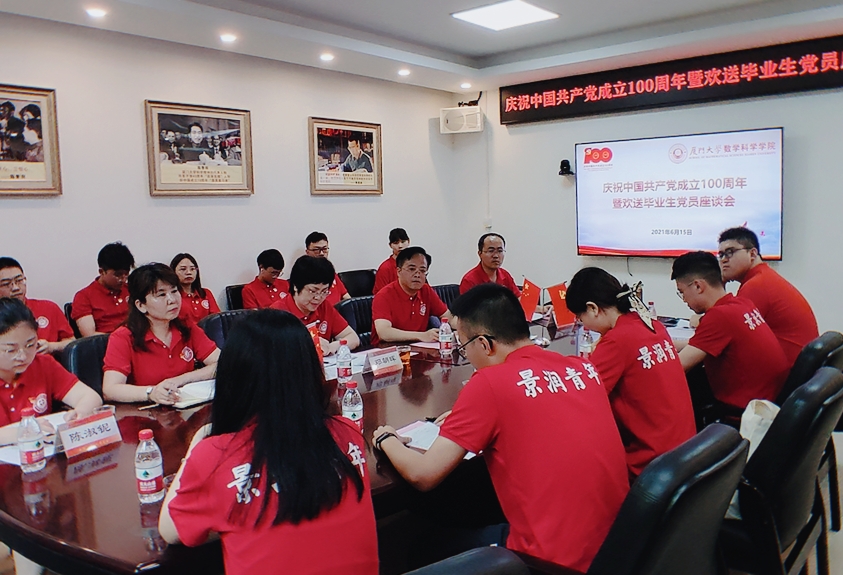 6月15日下午,数学科学星空(中国)庆祝中国共产党成立100周年暨欢送毕业生党员座谈会在海韵园行政楼B313会议室举行。厦门大学党委常委、副校长邓朝晖,星空(中国)党委书记黄宝秋,党委副书记丁昌利,团委书记于正伟,团委副书记陈淑铌,辅导员华盈鑫,26名2021届毕业生党员代表共同参加活动。丁昌利主持座谈会。